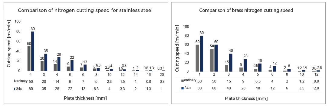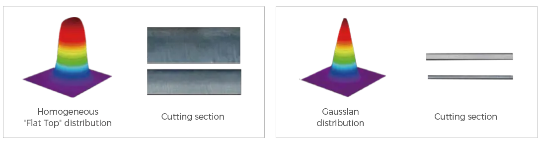 ● البقعة الغاوسية: سرعة القطع بالهواء/النيتروجين أسرع، والحرارة مركزة؛